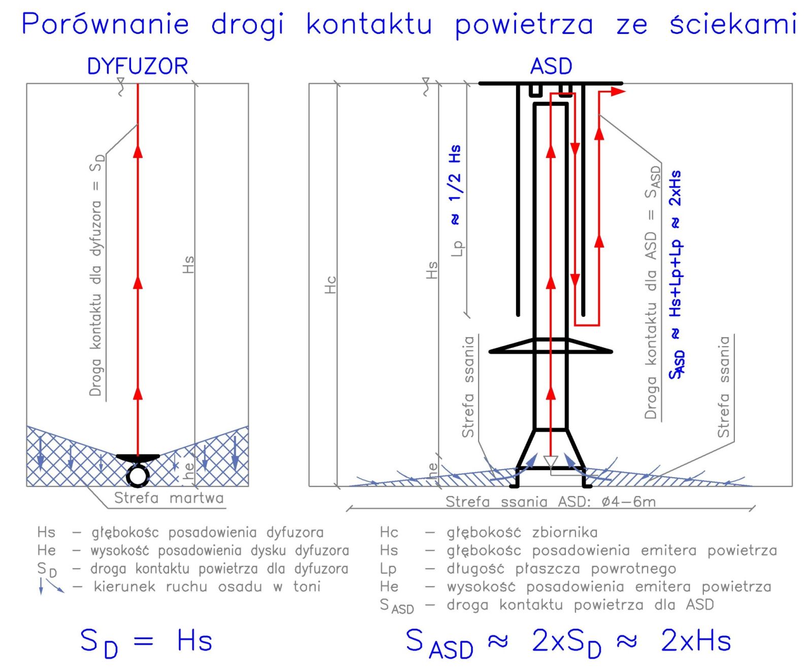 Poniżej przedstawiamy różnicę drogi kontaktu w dwóch porównywanych systemach, jak również strefę martwą pojedynczego dyfuzora w odróżnieniu od strefy odsysania osadów z dna podczas pracy ASD: