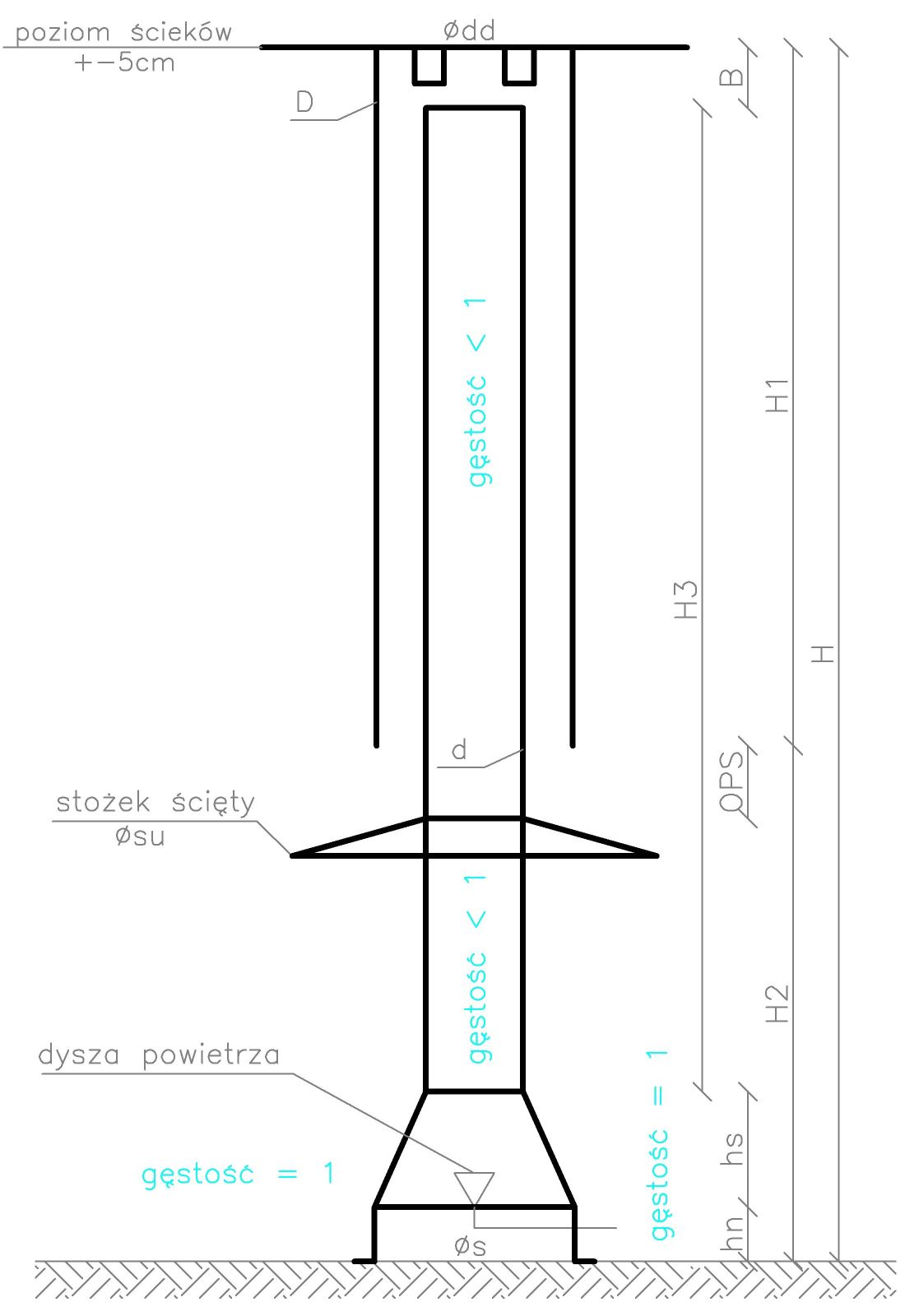 W czasie pracy ASD, rura ta wypełniona jest mieszaniną powietrza i ścieków (gęstość < 1). W związku z tym ciśnienie panujące w ASD na głębokości dyszy powietrza jest mniejsze, niż poza aeratorem (gęstość = 1). Jest ono na tyle mniejsze od ciśnienia hydrostatycznego, że nawet po uwzględnieniu oporów przepływu powietrza w rurociągu, manometry na dmuchawach pokazują ciśnienie mniejsze, niż ciśnienie hydrostatyczne słupa wody.