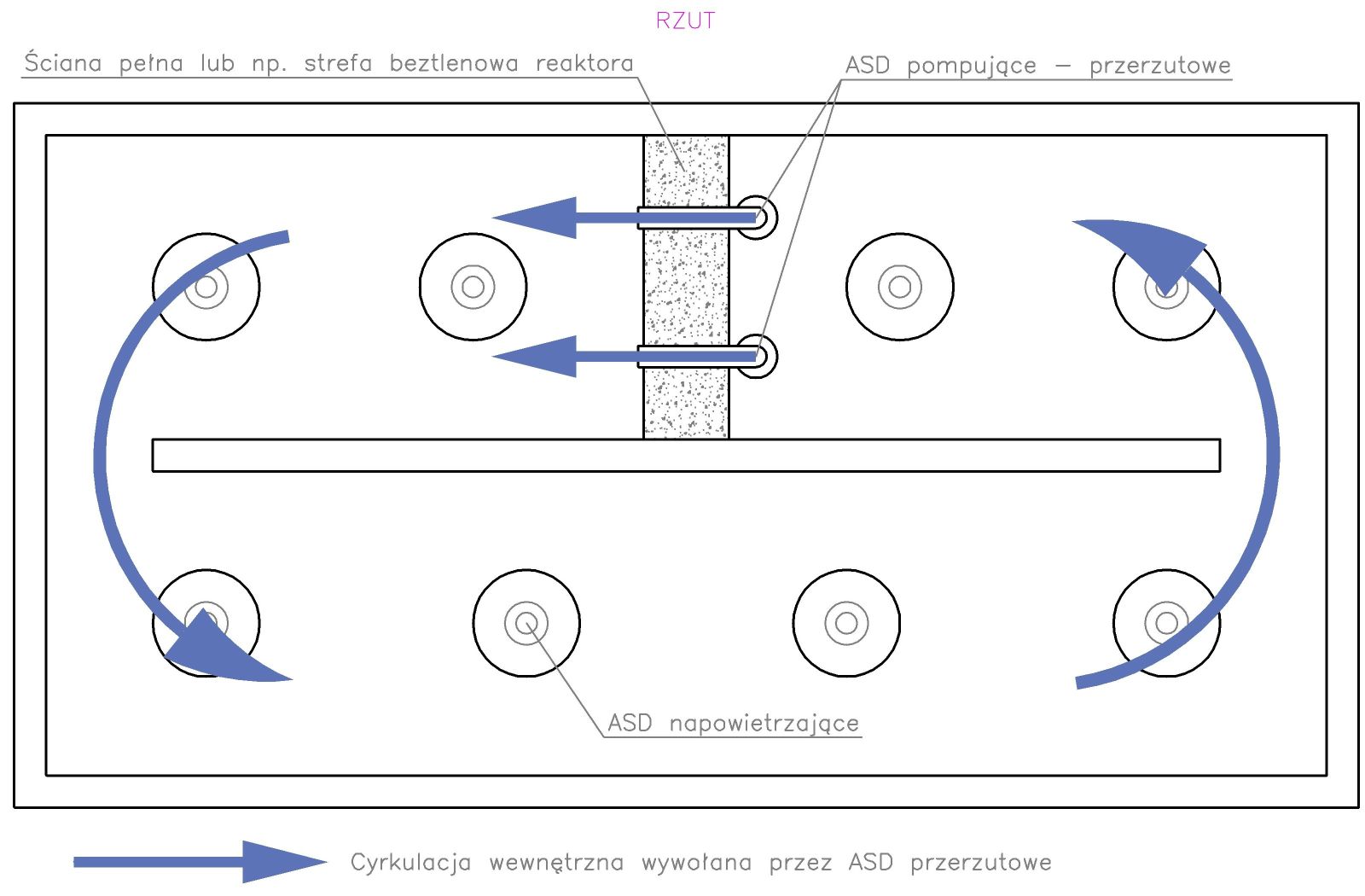 Należy ponadto pamiętać (jak zresztą wspomniano wcześniej), że ASD nie tylko napowietrzają i mieszają ścieki w objętości komory, ale są również wydajnymi pompami (typu "mamut"). Wiadomo również, że przemiany azotowe wymagają powtarzalności procesu (recyrkulacji). Recyrkulacja ta, dla różnych warunków, waha się od 300 do nawet 600 procent. W układach tradycyjnych (bez ASD) należy więc nawet sześciokrotnie przepompowywać całą dopływającą objętość ścieków na początek procesu. Oznacza to bardzo duży wydatek energetyczny. Natomiast wykorzystując aeratory ASD "przerzutowe" do napędzania cyrkulacji wewnętrznej uzyskujemy tę recyrkulację bezenergetycznie (bez konieczności wydatkowania dodatkowej energii na pompy lub mieszadła pompujące) i to w wielkości wprost proporcjonalnej do dopływającego ładunku (czyli tylko tyle, ile jest konieczne do prawidłowego procesu).