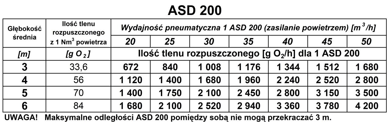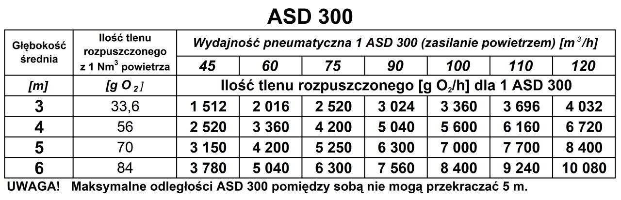 W związku z tym, uwzględniając zamieszczone powyżej wskaźniki procentowego wykorzystania tlenu dla danej głębokości i dobierając z katalogu dmuchawy o najkorzystniejszym stosunku mocy do wydajności przy tej samej głębokości, możemy zoptymalizować dobór ASD dla danych warunków, tj. uwzględniając głębokość i wymiary komory w planie. Konkretne wartości "wydajności tlenowych" ASD 200 i ASD 300, dla różnych obciążeń pneumatycznych, zestawiono w tabeli 5 i 6.